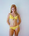 JILL IRELAND, 1960: Det tok litt tid før amerikanerne slapp bikinien løs, selv om sexsymboler som Marilyn Monroe, Jayne Mansfield og Rita Hayworth gikk foran. I mange delstater var plagget forbudt. Det løsnet for alvor rundt 1960, da filmindustrien kom opp med en ny strand-sjanger som ble populær blant ungdommer – og da 16 år gamle Brian Hyland sang om en «itsy bitsy teeny weeny yellow polka dot bikini», og solgte to millioner plater. Her viser skuespillerinnen Jill Ireland seg frem i det bittelille, gule, polkaprikkede vidunderet.Getty Images