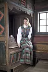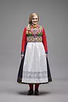 Fusabunad med forkle i fileringsteknikk: Bunaden fra Fusa bygger på drakt-materiale fra begynnelsen av 1800-tallet og er blant de mest fargerike i landet. Det største blikk-fanget er det gedigne, perlebroderte beltet. Men også forklærne er stor-slagne. De fins i utallige varianter, og mange velger bomull med påtrykt blomstermønster. Til høytidelige anledninger brukes et hvitt forkle med innfelling i fileringsteknikk. Vesten i empirestil er i håndvevet silke. (Foto: Norsk Flid Husfliden)