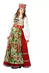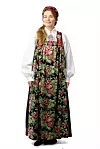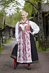 Festbunad fra Nes med rosemønstret forkle: Festbunaden for kvinner kom på slutten av 1700-tallet og utover 1800-tallet, da empire-moten med høyt liv var rådende i Europa. Ullbroderier i friske farger er et kjennetegn for Hallingdal. På Nes (Nesbyen) ble det opprinnelig brodert rett på stakken, men i dag kan man også ha broderte bånd nederst. Det blir brukt forkle i rutete ullstoff eller blomstret ullmusselin, som her. Tradisjonelt bunadssølv er Halling-heng med spenner, halsring og en stor sølje. Bruker man jakke (stutt-trøye), kan man ha perlebroderte mansjetter (fyrierma). (Foto: Rasmus Werner/Norsk Flid Husfliden)