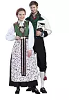 Hardangerbunad med mønstret forkle: Hardangerbunaden er best kjent med rødt liv, foldet stakk og hvitt forkle med hardangersøm. Denne varianten med grønt liv, rynket stakk og bomullsforkle med påtrykt blomstermønster er trolig en rekonstruksjon av antrekk fra ca. 1870, da mangfoldet var større enn i dag. De hvite forklærne med hardangersøm var opprinnelig forbeholdt høytid og fest, så dette er en mer hverdagslig variant. De vevde båndene som henger ned fra beltet, kalles fangbånd eller breiaband. De indikerer at denne varianten er fra Kvam. Herrebunaden er fra Øst-Telemark. (Foto: Wenche Hoel-Knai)
