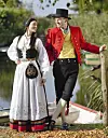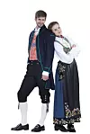 Øst-Telemarksbunad med brodert ullforkle: Kvinnebunadene fra Øst-Telemark preges av de vakre ullgarnsbroderiene. De finsi flere varianter, og den til venstre. kalles «prinsesse med bånd». Den kjennetegnes ved det røde livet og broderiene i såkalt prinsessemønster som pryder alle deler av drakten, inkludert det sorte ullforkleet med folder, store broderier og en brodert, rød kant rundt det hele. Herrebunadener en rundtrøye fra Telemark. Til høyreen beltestakk med bånd og rødt liv.(Foto: Almankås AS)