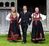 Aksel Waldemar-bunad med brodert forkle: Bunaden har fått navn etter kunstneren Aksel Waldemar Johannessen, som i 1922–23 tegnet broderimotivet etter en gammel, blå stakk på Norsk Folkemuseum. De fant ikke noe liv som passet til, men Aksel Waldemar tok utgangspunkt i den gamle stakken og tegnet ut et rikt broderimønster til stakk, liv, lue og forkle. Bunaden fikk blå stakk med svart bord, grønt liv, svart silkeforkle og lue – alt brodert med fargerike blomstermotiver. Aksel Waldemar-bunaden ble en forløper for de andre bunadene fra Gudbrandsdalen, og i dag kalles bunaden hans også Gudbrandsdalen B95. Herrebunaden er fra Østfold.(Foto: Wenche Hoel-Knai)