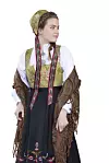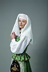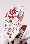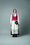 TRØNDERBUNAD MED KONESKAUT: Hodeplaggene til trønderbunaden er enten et skaut eller en lue. Skautet har sitt opphav i Selbu og er opprinnelig et brudeklede som ble lagt oppå annen hodepynt. I dag brukes det alene. Det er utført i stivet, hvit lin med hullbroderier og har border i uttrekkssøm. Foto: Norske Bunader