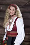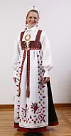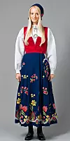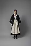 BALSFJORDBUNAD MED LUE: På hodet kan man enten ha sort, brodert pikelue som her, eller hvitt, brodert koneskaut. Sølvet har utgangspunkt i helleristninger på Tennes. (Foto: Norsk Flid Husfliden)