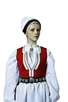 NORDMØRSBUNAD MED LINHATT OG PIKHUV: Kvinnebunaden fra Nordmøre ble presentert i 1935 og har sitt utspring i folkedrakter fra indre Nordmøre på 1800-tallet. Den fås med liv i rød, vinrød eller blågrønn ulldamask, alternativt rosa eller blågrønn kalemank. Livet er pyntet med bånd eller kniplinger i sølv eller gull. Gifte kvinner brukte tradisjonelt linhatt med kvitsaum og kniplingsblonde, festet med et silketørkle, som kvinnen på bildet. De ugifte brukte pikhuv (pikelue), en spiss, svart hette med broderte bånd. Foto: Norsk Flid Husfliden