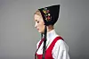 TRØNDERBUNAD MED KONESKAUT: Luen er i ullstoff med broderier i tre varianter som røper om man kommer fra Selbu, Kosberg eller Singsås. Foto Norsk Flid Husfliden