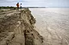 Men hvor lenge det holder, er svært uvisst. Sammen med Jamir går jeg en tur på dette diket. Ikke langt unna der Bogaliparas innbyggerne har satt opp sine hus, har diket revnet og blitt tatt av Brahmaputras vannmasser. Og mens jeg står her, faller store biter av elvebredden ned i vannet.