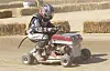Hva skjer så? Førerne freser gjennom løypa i håp om å bli verdens beste gressklippersjåfør.