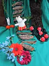 Slepet er full av fiffige detaljer. Lille My sitter og husker. To rosa snegler har plassert seg strategisk der hvor slepet går ned i bakken. Brudeparets initialer er brodert inn i hjerte på en trestamme. Et knippe sopp som opprinnelig var en del av en lyslenke, passer perfekt inn i scenen. Anita plasserte utallige blomster i ulike farger, fasonger og materialer rundt omkring på kjolen.
