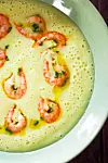 Pisk opp suppen med en stavmikser rett før servering. Tilsett reker og dryss over gressløk eller persille.