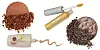 FRA VENSTRE: Gosh Glamorous Eye Shadow i fargen Copper (kr 89), Oriflame Visions Fresh Face Foundation (kr 89), Star Gazer Cream Eye Shadow i fargen Gold (kr 65), L'Oréal Chrome Shine Eyeshadow i fargen Brown Lamé (kr 99).Foto: Svein Erik Tøraasen/Blueline Studios