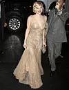 Kveldsantrekket gir assosiasjoner til 90-tallet med de store skoene, den tunge sminken og den ubestemmelige lengden på kjolen. Fargen på kjolen med én skulder er også i en skala man så mye til på 90-tallet. Håret er løsnet og rufset til siden dagfrisyren.