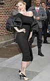 Onsdag fikk vi en liten flashback til 80-tallet da Drew gjestet David Letterman i hans talkshow. Den åletrange, svarte kjolen med gigantiske puffermer er fra Giambattista Valli. Håret var satt opp i en stram topp, og Drew hadde valgt å beholde de røde leppene og neglene fra dagen før.