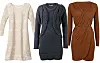 HVERDAGSKJOLER: Hvit blondekjole (perfekt til svart skinnjakke og svarte tette strømpebukser), kr 399 fra H&M. Strikk er perfekt nå på høsten! Denne er fra Only og koster kr 360. Drapert og figurflatterende får du på Cubus til kr 249.Foto: Produsentene