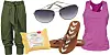 FRA VENSTRE: Haremsbukse fra Cubus (kr 299), våtservietter fra Simple/Vita (kr 57,59), solbriller fra Oasis (kr 199), flip flops fra Hummel (kr 249), sinlget fra H&M (kr 129).Foto: Svein-Erik Tøraasen/Blueline Studio