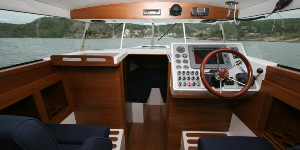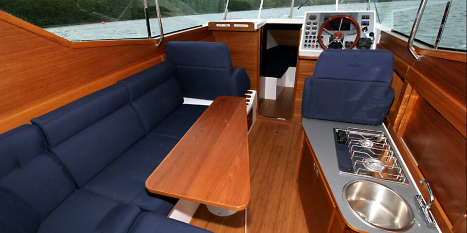 Stilmessig er det lite å utsette på svensken. Dette er en elegant båt med lekker finish både i treverk og tekstiler, og båten er praktisk med tanke på bruksområdet: frakt av personer fra A til B. Den L-formede aktersofaen gir bra komfort, så også V-køya under dekk. Og selv om toalettet er i minste laget for fullvoksne menn, er turaspektet for to personer så absolutt til stede. Et lite styrbordplassert pantry og et brukbart bord bidrar til dette.