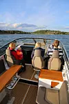 Bak rattet kan du da fort velge om du vil sitte tett på. Da slipper du å slenge rundt i røff sjø og det blir enklere med betjening av kartplotteren. Så kan du heller skyve deg bedagelig bakover når cruising-øvelser står på programmet. Du sitter ganske høyt og fritt, med god oversikt. Vindskjermen er stor og trukket langt bak, det gir lune forhold foran i cockpit.