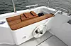 Det som gleder meg mest med denne båten, er fokuset på detaljer og komfort for alle under tak. Alt ser innbydende og delikat ut, og fokuset på finish er tydelig i den mattlakkerte teaken. Minor har tatt i bruk Niroxx i setene, et alcantaraliknende kunststoff som er tett og gjør rengjøringen enkel. Dessuten har man i likhet med Windy tatt i bruk Nextel-coating på dashbordet, noe som gir en eksklusiv finish. Vakkert, men heller ikke spesielt billig.