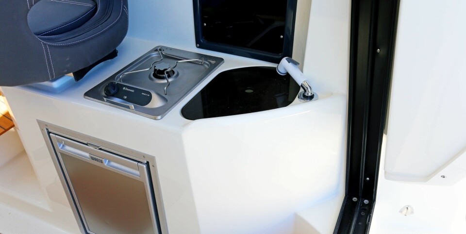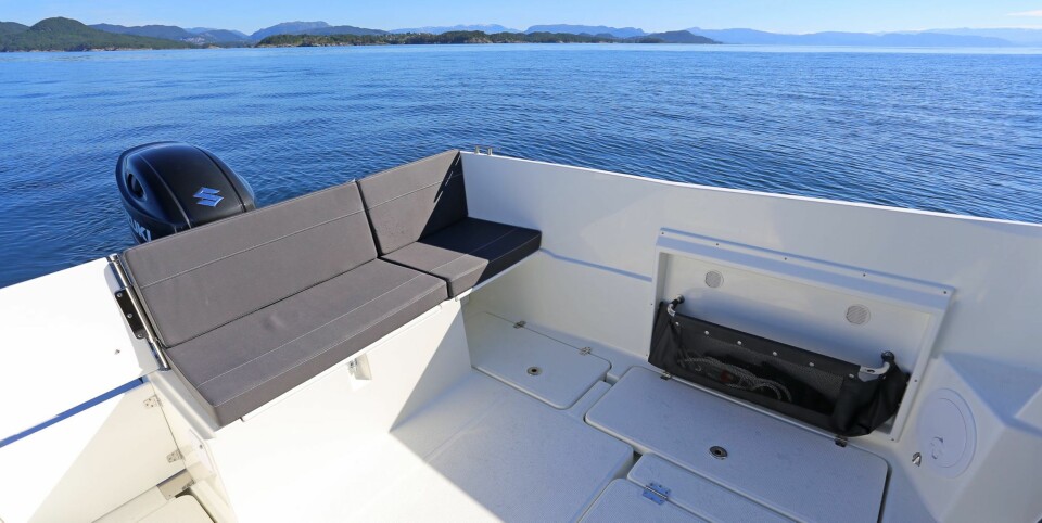 Ut gjennom den solide skyvedøren kommer du ut på et rommelig akterdekk. Vår testbåt har ekstra styreposisjon uten, spesielt kjekt om du driver fiske med ulik redskap. Weekend-konseptet betyr at uteplassen også egner seg til mer enn bare fangst, med mulighet til raskt å rigge opp sitteplasser med puter.