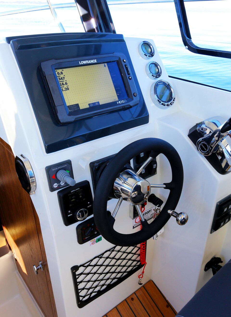 I instrumentbordet finner vi også kontrollen for det nye ZipWake trimsystemet med blader som går rett ned i vannet i stedet for de tradisjonelle flapsene. De skal ifølge produsenten gi deg automatisk trimming av båten. I utgangspunktet er det bare å trykke «autoknappen» på ZipWake-kontrollen, men du kan gå inn i menysystemet og sette opp egne parametere, eller bruke den manuelle styringsfunksjon med hjulbetjeningen foran på cockpitkontrollen.