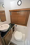 Nede under dekk ligger det todelte toalettrommet. I styrbord side er det eget dusjrom, mens selve marinetoalettet og vask er plassert i et eget rom i babord side. Akkurat denne løsningen gir vi klart pluss for. Om man ikke har et stort rom med plass til egen dusjnisje, er løsningen med separat dusjrom et klart pluss. I lengderetningen sparer man plass og de fleste bruker dusjrommet sjeldnere enn selve toalettet. Og så slipper man alt vannklinet der man ikke vil ha det!