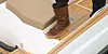 Selv om cockpiten er fullt møblert, er det likevel sørget for nok plass til passasje gjennom og ut/inn av båten. Det er fine utsparinger for å sette føttene uten å måtte tråkke i setene. Dessuten er det lett tilgang om bord fra høyre side akter. Forut går du inn/ut av båten gjennom midtvinduet. Vår testbåt var en tidlig produksjonsbåt, og avstivningen av det lille dekket forut var ikke god nok. Med en person på 80–90 kilo på fordekket, ga det litt etter og gjorde at vindskjermen kunne bli noe treg å åpne. Ifølge Espen Thorup ble det lagt inn en kraftigere avstivning tidlig i 2015.