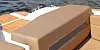 Det største og viktigste innslaget i cockpit er den store L-sofaen akter. Den strekker seg forover på venstre side og ender opp i med en vippbar seterygg. Dermed fungerer enden som copilotstol eller du kan sitte bakovervendt og bruke det som en solstol. Sofaen kan kompletteres med solputer (standardutstyr) og et bord (ekstrautstyr). Vår båt hadde også kjøleboks på 30 liter under sofaen og ferskvannstank på 14 liter i stuverommet under cockpitdørken.