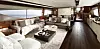 Spesielt de syv meterne i bredden merkes godt. Her er det to separate sofaer på babord side, og en benk som går langs hele skutesiden på styrbord side. Materialvalgene er en kombinasjon av lyst skinn og stoff samt klassisk, mørkt treverk. Dette går igjen gjennom hele båten, og selv i mannskapslugaren finner man skinnkledde vegger og eksklusivt treverk.
