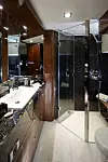 Den tar hele båtens bredde, og aktenfor lugaren finner man et stort bad på styrbord side. Dette er blant annet utstyrt med bidet i tillegg til dusjen, som er på størrelse med hele badet i mer normale båter, to håndvasker og et porselenstoalett. Vegg-i-vegg med badet har eieren valgt å plassere en walk-in-garderobe med mer enn nok plass til både omkledning og lagring av de rene klærne som har blitt vasket i crewkabinen.