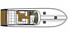 Under dekk finner vi mer av luksusen som bor i denne båten. I midten av båten finner vi en sofagruppe og et kjøkken, helt foran i baugen finner vi masterkabinen med dobbeltseng og eget bad.