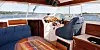 At Hansvik har satset på romfølelsen merkes så fort vi kommer under tak. Faktisk er det aldri under 1,95 m takhøyde noe sted om bord - et stort pluss for lange skandinaver. Salongen er innredet i lys, epoksydekket teak som trolig er like vedlikeholdsvennlig som den er blank. Sofahjørnet på babord side har plass til seks-sju personer, og sitteplassene er meget behagelige. Men sofaen burde hatt samme høydenivå som førerstolen: Utsikten mot bølgetoppene kunne nemlig vært bedre for de laveste blant oss.