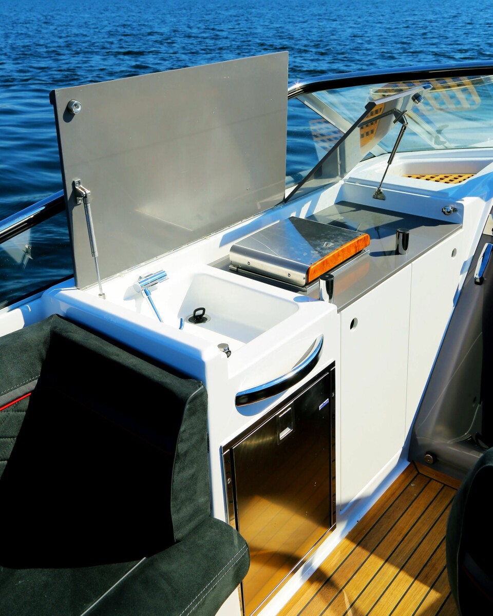 Den andre store forskjellen på Ibiza 811 Touring og 760 Touring finner du ute i cockpit: Her har den nye modellen en god bysseløsning med Wallas 800T parafindrevet koketopp og et 49 liters kjøleskap som standard. Vasken er koblet til vanntank på 56 liter med trykkvann. En nøytral, grå plate vippes opp og holdes opp av en gassdemper og gir et ryddig inntrykk når byssa ikke er i bruk. Det er god oppbevaringsplass i de to skapene under kokeapparatet.