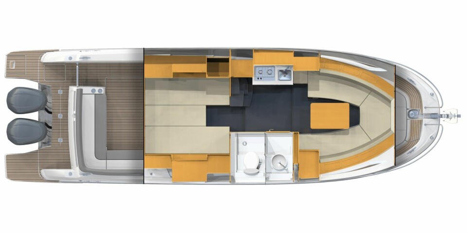 Når man kikker på den høyreiste, skarpe baugen og tar med i beregningen den store pondusen en 34-foter har i sjøen, er det stor sannsynlighet for at Jeanneau har sine ord i behold. De to Yamaha F300 på hekken er nok en fornuftig dobbeltinstallasjon til denne båten.