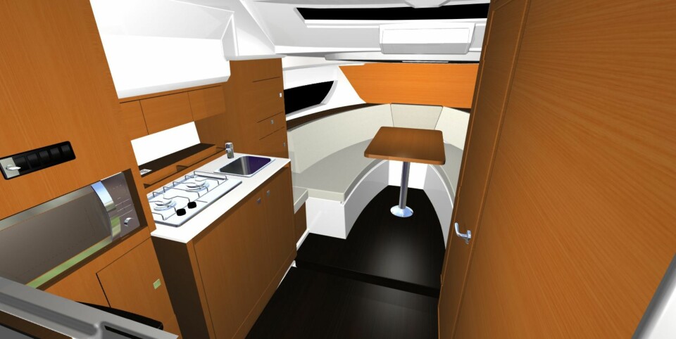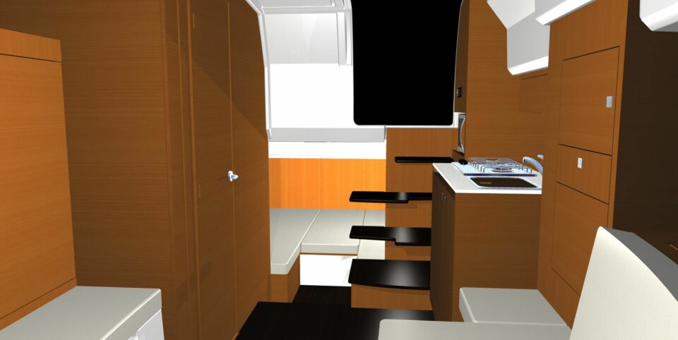 Forut er det U-sofa med bord i midten, som gjøres om til dobbeltkøye ved behov. Helt akter er det inngang til en midtkabin med to soveplasser. Siden soveplassene er plassert i hver sin ende av kabinen, er det håp om en viss grad av privatliv underveis.