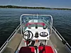 Sittende i komfortable rotasjonsstøpte plaststoler til babord bak den store styrekonsollen i aluminium med vindskjerm i pleksiglass, har du god oversikt og grei føling med styring og motorkontroller om bord i Kaasbøll Boats 19. Litt utenom det vanlige, finner vi batterikassen plassert rett under styringen. Her har du dermed full kontroll med det elektriske.