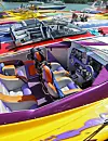 Hadde jeg sklidd inn i en nordisk gjestehavn i en av disse farkostene, ville det vært vanskelig ikke å rødme, og om noen hadde kalt både båtene og dagens opptrinn for "harry", ville jeg ikke sagt meg helt uenig. Her finnes en herlig miks av lilla, oransje, røde og sjokk-gule fargesammensetninger; svulstige, skinnkledde cockpiter; enorme, spesialbygde motorblokker med uhørt sylindervolum; og dashbord med flere instrumenter enn en Boeing 747.