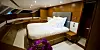 Styrbord skrog er delt i to separate avdelinger. Akter er det egen gjestekabin med plass til to og et stort lager med blant annet kjølerom og vinkjeller. Fra midten og fram i baugen ligger eierlugaren (eller den som betaler mest av leien…). Her finner du utstyrsdetaljer som forventet; stor LED-TV, eget skrivebord, panoramavinduer, garderobeskap, bokhyller og et eget baderom.