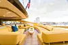 Det overrasker nok ingen at denne båten er lastet med luksus fra hekk til baug. Det første som møter deg i akterenden er en gigantisk, bakovervendt solseng. Rett foran denne befinner det seg én av de største utesalongene vi har sett. Undertegnede har sannsynligvis ikke stor nok familie, selv medregnet både tremenninger og grandtanter, til å fylle opp salongen som er nesten like bred som hele båten.