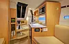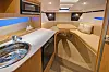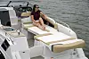 Med lengde på 7,62 meter og bredde på 2,55 meter har den et lite fotavtrykk. Men når du ser båten på vannet er det ikke vanskelig å se hvor den får den store plassen fra. Skrogsidene er høye, rette og trukket så langt fram og bak som praktisk mulig. Nei, vi snakker ikke elegante linjer her, men maksimal plassutnyttelse. Det blir enda tydeligere når du går ombord, mest praktisk via fordekket eller akterplattformen. For cockpiten er full av innredning, med innholdsrik wetbar på babord side akter, loungesete på samme side forut, en bred sittebenk på førerplass og en sofaløsning med stor grad av variabilitet på styrbord side akter. Her kan du rigge til spiseplass med bord, eller bruke bordet som underlag for en stor solseng. Seteryggene kan vippes i begge retninger og den bakerste også legges helt flatt. Det lukter bading, soling og godværshygge lang vei.