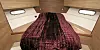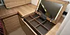 Her nede finner vi en fin salong med spiseplass for opp til seks personer, en L-formet bysseløsning med komfyr, kjøl og avtrekk, samt nok med skapplass og stuv. Innredningen i testbåten var i hel- og laminert valnøttre, men kan også leveres i eik. Standard fargevalg i tekstiler og skinn er plomme, limegrønn eller sjokoladebrun.