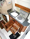 På styrbord side finnes et lite pantry medkoketopp og vask, med skapplass til det viktigste og et 49 liters kjøleskap under. Mye lys slippes inn gjennom glasstaket og ved førerplass sitter man høyt og har god sikt over instrumenteringen og ut gjennom de store vinduene.