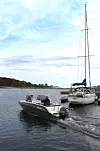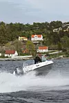 Yamahas 50-hester på akterspeilet høres ikke direkte imponerende ut, men der blir vi overrasket. Motoren er sprek og drar båten raskt i plan. På loggen og med en mann om bord, leser vi over 28 knop på fartsmåleren. Med to mann om bord, viser våre GPSmålinger en toppfart på 27,4 knop ved 5500 o/min og et forbruk på 0,66 liter pr. nautisk mil.