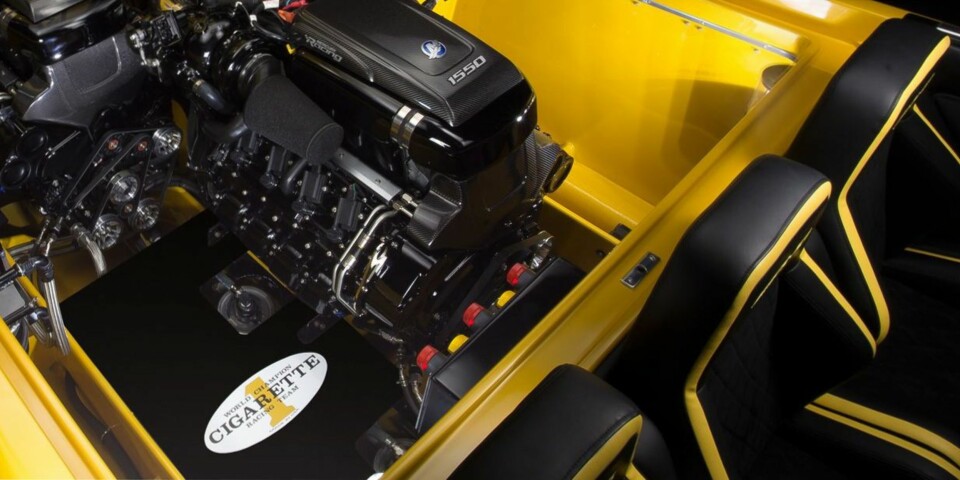 510 hestekrefter er småtteri i forhold til hva som bor i motorrommet i 50 Maurader. Gang det med seks, og vi nærmer oss. To 1550 hestekrefter sterke twinturbo-V8-ere fra Mercury Racing setter fart på det sorte og gule, femti fot lange lynet.