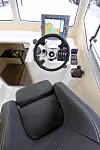 På akterdekket er det klappseter i forbindelse med rørarrangementet, og her kan det leveres puter. Foran konsollen er det mulig å sitte, men fordi man har tatt hensyn til høyden i kabinen, blir man sittende for høyt uten støtte for beina.
