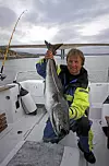 Fisken til pappa stikker en annen retning, og han har plutselig kommandoen. Etter noen minutters kamp skimtes en lang og blank skapning noen meter under oss. - Storsei, roper pappa. Sekunder senere ligger fisken på dekk og et jubelbrøl slippes løs - bildet av tikilosen jeg lovet redaktøren er reddet. En glad storfisker poserer ivrig mens undertegnede tar bilder etter beste evne, skjelven etter kampen med beistet som forsvant.