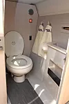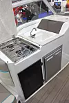 Den litt retroaktige vindskjermen er trukket helt tilbake til sittegruppen. Den ser også høy nok ut til at folk om bord skal sitte i le for vinden. Et lite pantry med gassbluss, vask og kjøleskap er å finne på babord side, og to skritt ned i kabinen finnes et – til båtstørrelsen å være – romslig toalettrom. Undertegnede på 192 centimeter sitter i hvert fall tilstrekkelig godt for å gjøre sitt fornødne.