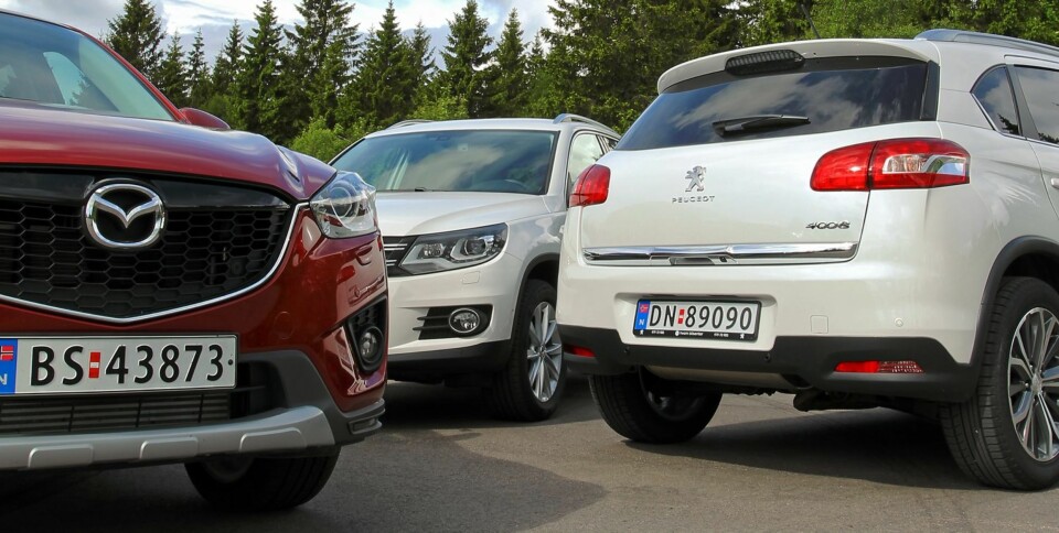 | Bilmerke Modellbetegnelse Motor, cm³: Effekt, hk ved o/min: Dreiemoment, Nm ved o/min: Egenvekt, kg: Tilhengervekt, kg: Lengde/bredde/høyde, cm: Bagasjerom, liter: Standard dekkdimensjon: Forbruk, EU-mix l/mil: CO2-utslipp, g/km: 0-100 km/t, fabrikk, sek.: Toppfart, km/t: Pris fra, kr: Pris testbil, kr: | Mazda CX-5 2,2D auto 2189 150/4500 380/1800-2600 1565 2000/750 456/184/171 503-1620 225/65-17 U 0,55 144 10,2 194 387 700 430 700 | Peugeot 4008 4x4 1,8 e-HDI 1798 150/4000 300/2000-3000 1570 1400/750 434/177/163 440-2200 215/70-17 U 0,56 147 11,5 198 409 900 409 900 | VW Tiguan 2,0 TDI CR 140 4MOTION DSG 1968 140/4200 320/1750-2500 1664 2200/750 443/181/160 470-1510 215/60-17 T 0,6 158 10,4 187 406 700 488 100 |