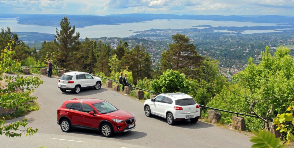 Både Mazda og Peugeot fremstår som spekket med utstyrsgodis. Om alt er like nødvendig, får bli opptil den enkelte å vurdere. Vil du spesifisere den mer nøkternt utstyrte VW Tiguan opp til samme nivå, blir det enda dyrere enn de snaut 490 000 kronene testbilen koster. Større hjul og navigasjon er det som i så fall trekker prisen mest opp. Om den elementbaserte utstyrspolitikken til VW koster mer enn pakkeløsningene i de to andre, kan du i det minste styre unna ting du ikke vil ha.