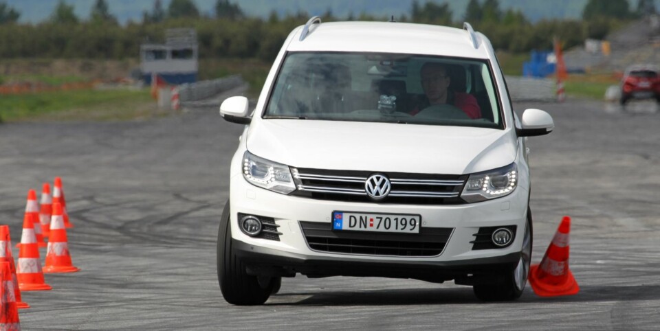 I teten er det tett mellom en svært kontrollert VW Tiguan, og en litt mer temperamentsfull Mazda CX-5. Tyskeren går gjennom testen med en markert understyringstendens på moderate 17-tommers hjul. Japaneren er mer dramaqueen: Den løfter på bakhjulet, men har godt feste i front på sine store 19-tommers hjul - standardutstyr i Sport-pakken. I unnamanøver og slalåmtestene er det totalt sett mest veigrepsressurser i CX-5, men biltype og bruksområde tatt i betraktning, liker vi den udramatiske opptredenen fra VW Tiguan best.