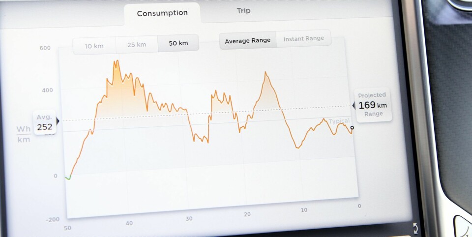Vi får låne P85D i for kort tid til at vi får gjennomført vår forbrukstest i den faste testløypa. Men vi rekker å kjøre bilen i 73 mil, og ser i løpet av denne distansen at forbruksmønsteret er det samme som da vi kjørte P85 med bakhjulsdrift vinterstid i 2013.